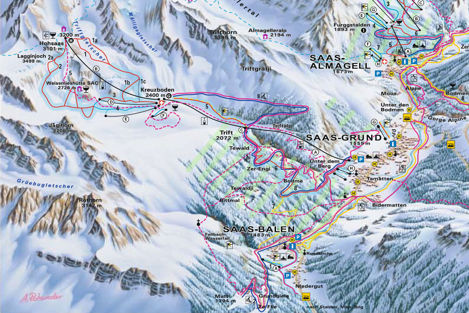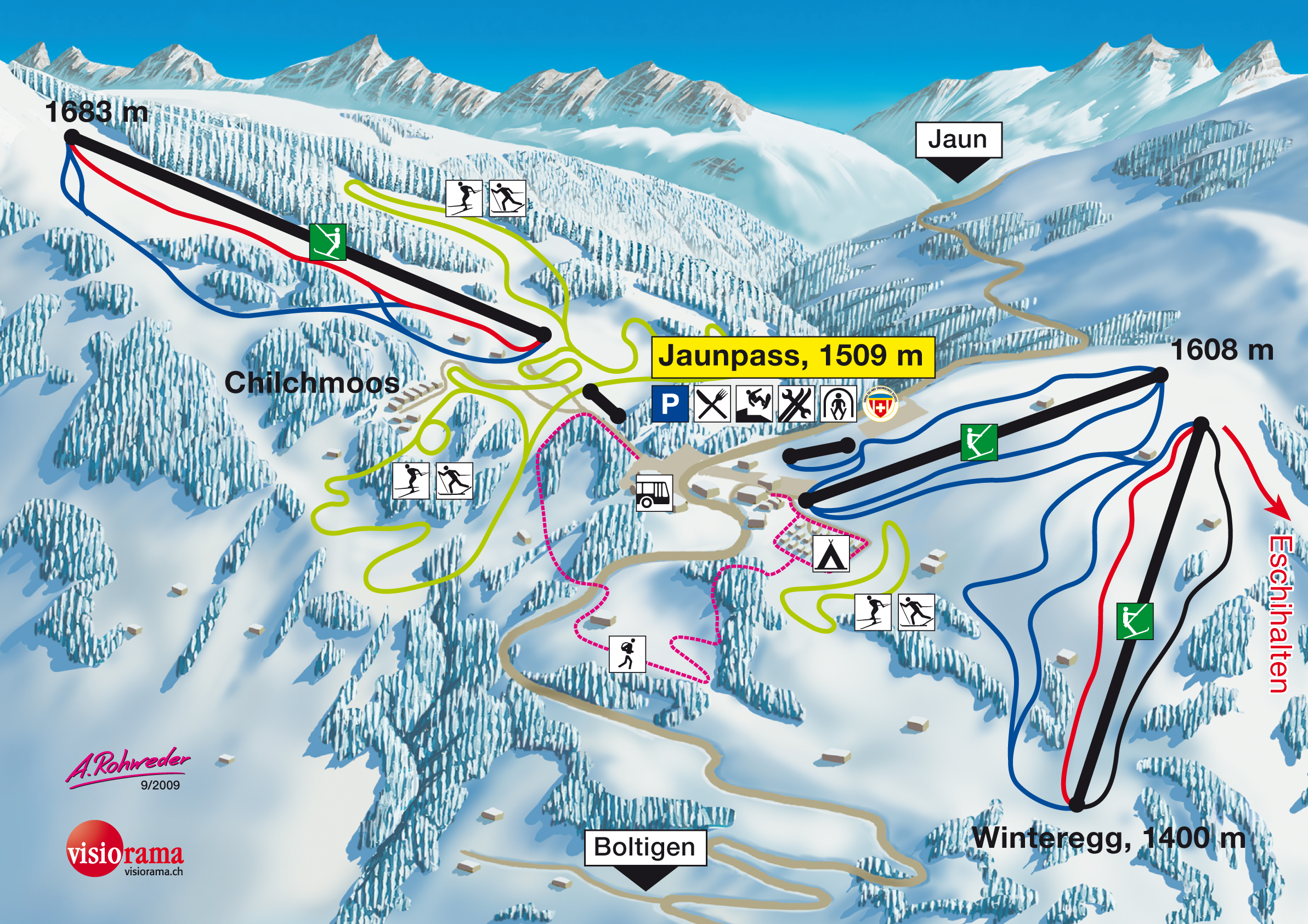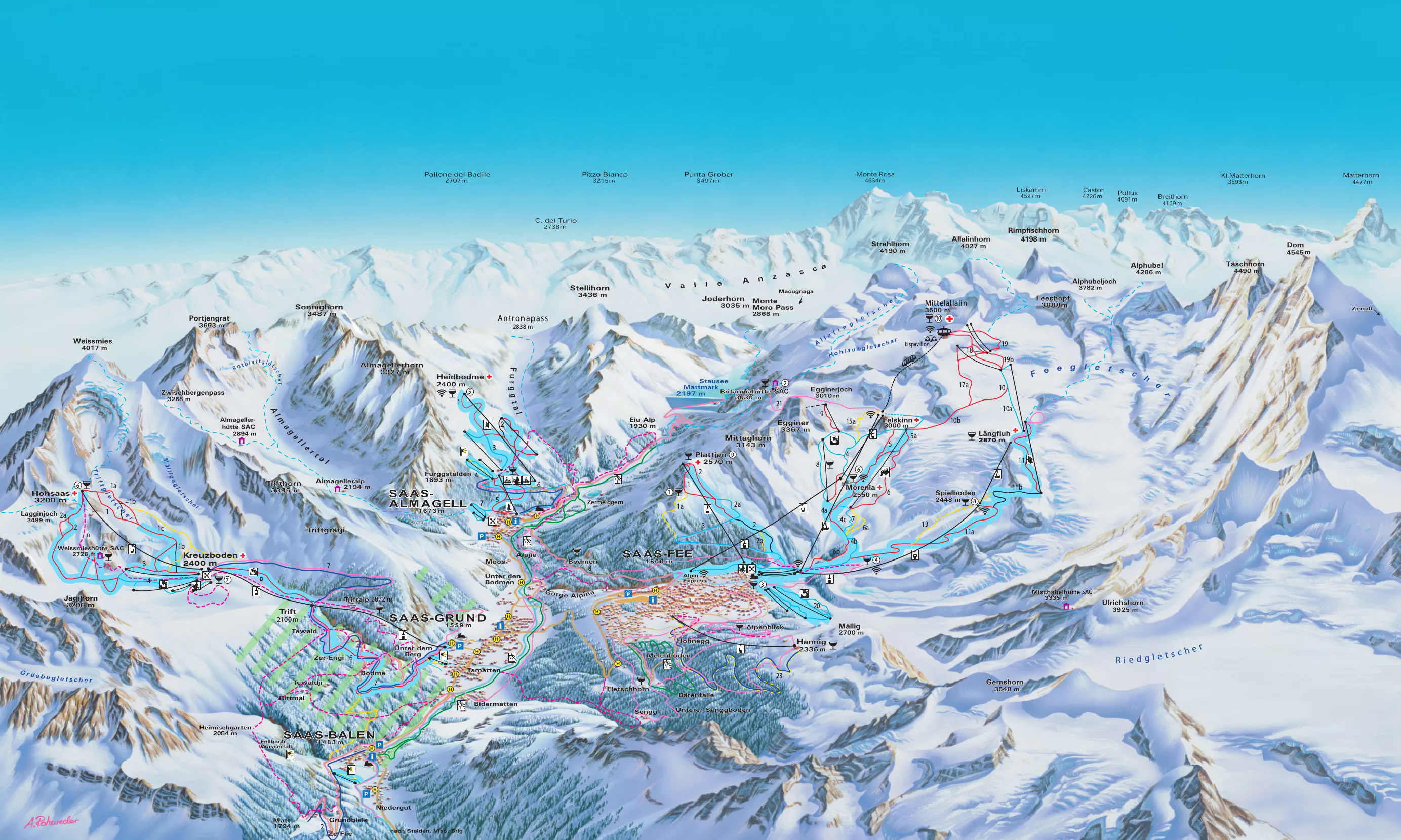 There are piste maps (trail maps) on file for the following places in Switzerland. Simply click on the thumbnail to access the best, most recent piste map we have available. Click on the place name to be taken to the page for the resort associated with the place name. Please feel free to advise of more recent piste maps or any copyright issues at this page. More summary resort information is available by using the resort finder.